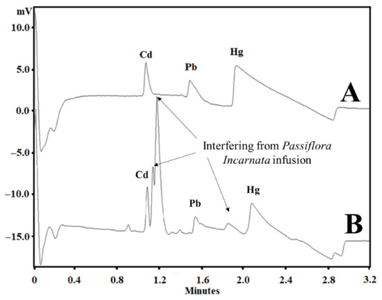 (A) Electropherogram of Cd2+, Pb2+, and Hg2+ standards at 6, 3, and 6 µg mL−1, respectively, in ultrapure water; (B) Electropherogram of Passiflora incarnata tea spiked with Cd2+, Pb2+, and Hg2+ standards at 6, 3, and 6 µg mL−1, respectively. Other conditions: +30 kV, 20 °C, BGE with 5 mmol L−1 imidazole, 6 mmol L−1 HIBA, 20 mmol L−1 18-crown-6, 12 cm effective length, 50 cm total length capillary, hydrodynamic short-end injection (0.5 psi by 5 s), and indirect detection at 214 nm.