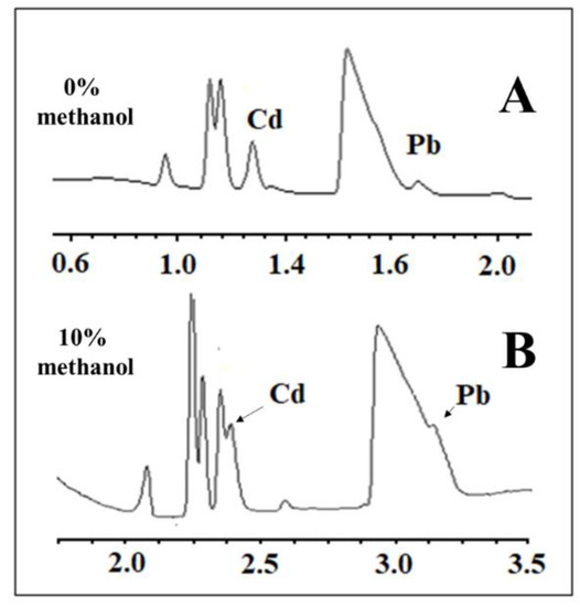 Many variables are important when obtaining CE separations, such as temperature, voltage, buffer pH, BGE composition, and buffer modifiers. Special attention needs to be paid to inorganic cations’ determination/detection by CE [17,18,19,20]. Most inorganic cations do not show absorption in the UV-Vis region, thus a chromophore addition in BGE is needed, such as imidazole [21]. In addition, mobility values in this kind of ions can result in similar migration times that lead to a poor resolution between them. Thus, a better inorganic cations separation can be achieved by changing their mobilities when complexing agents are used in a BGE. The literature recommends the use of 18-crown-6, individually or combined with another complexing agent, as well as with HIBA and with some organic modifiers as methanol [21]. Therefore, in this study, 18-crown-6 was evaluated, combined or not with methanol, as a BGE modifier, after some initial experiments with lactic acid, which did not promote the separation of Cd2+, Pb2+, and Hg2+ (Figure S1).