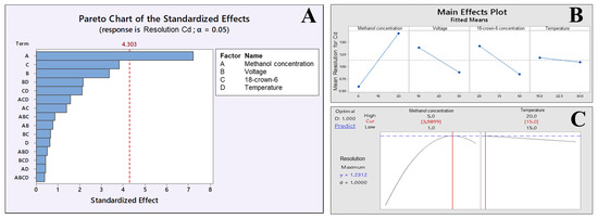 (A) Pareto, (B) main effects, and (C) desirability (methanol concentration and temperature). Graph obtained through DOE by Minitab® software to optimize the separation by CE for Cd2+ and Pb2+ determination in Passifora incarnata tea.
