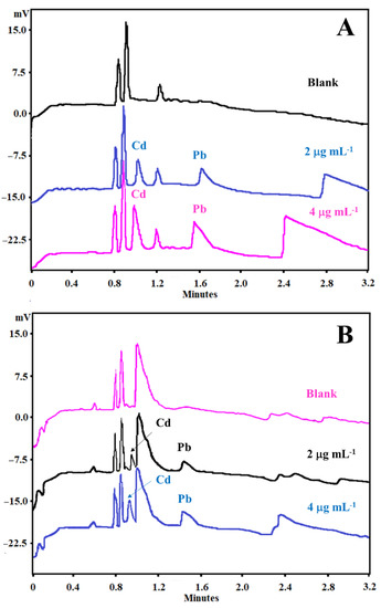 Electropherograms of Cd2+ and Pb2+ standards at 2 and 4 µg mL−1 spiked in (A) ultrapure water (black line, blank; blue line, 2 µg mL−1; pink line, 4 µg mL−1) and (B) Passiflora incarnata tea samples (pink line, blank; black line, 2 µg mL−1; blue line, 4 µg mL−1). Conditions: indirect mode, 12.2 cm effective length, 50 cm full-length capillary, BGE with 5 mmol L−1 imidazole, 6 mmol L−1 HIBA, 32.5 mmol L−1 18-crown-6, 3.8% methanol, temperature at 20 °C, hydrodynamic short-end injection (0.5 psi by 5 s), and detection at 214 nm.