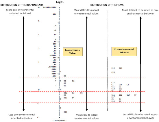 The Rasch technique has attracted researchers to validate and evaluate constructed items in creating a good survey [57,58]. In this study, the Rasch measurement model was used to identify the relationship between environmental values and the intention for behavioral environmental conservation (among people in the low socioeconomic group). In the model of this study, persons represent the respondents with low socioeconomic status in the district of a state in Malaysia and the items represent the environmental value orientation and intention for environmental conservation behavior. The distribution of persons and items was measured using a measuring standard known as “logits”. Rasch models transform the raw data and allow conjoint measurement of people and items in the same scale. This is accomplished using the item map, also known as the Wright map, where the person and items are plotted on the same logit scale or ruler. Bond and Fox [59] explained that the Rasch model allows the researcher to identify two aspects: (1) the items that are easily agreed or disagreed upon by the person (respondents), and (2) a person with high ability may be more agreeable with all the items, which means a high-ability person finds it easy to endorse the survey. In this study, it was assumed that the respondent’s espoused environmental values should relate to the behavior that contributes to environmental conservation.