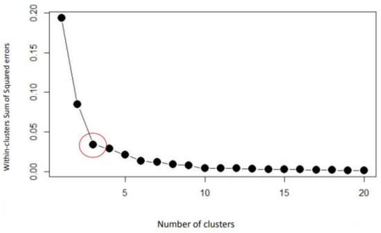Determination of optimal cluster number. The optimal number is visualized by the inflection point that corresponds to three clusters, as shown by the red circle.