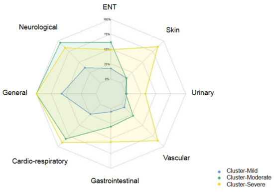 The symptom distribution by symptom categories in the three clusters is represented in Figure 2, which shows the differences among the clusters.