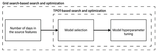Model selection and hyperparameter tuning We used a combination of a grid search [26] and Tree-Based Pipeline Optimization Tool (TPOT) [27] to find the optimal auto-ML configuration, including the optimal number of days in the source values, model selection, and the model’s hyperparameters. The models used by the TPOT framework are all the regression ML models found in the scikit-learn library [28] and the XGboost model [29]. A schematic view of the model auto-ML training process is shown in Figure 1.