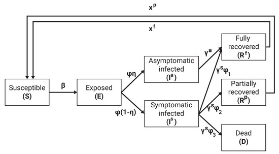 Afterward, each infected individual has a probability to infected susceptible individual if and only if , in a pair-wise manner. If a susceptible individual is infected, it immediately becomes exposed (i.e., ). Exposed individuals transform to the asymptomatic or symptomatic infected state where . Infected individuals transform to either the dead, partially recovered, or fully recovered epidemiological groups where and , respectively. Finally, partially and fully recovered individuals transform to the susceptible group where and , respectively.