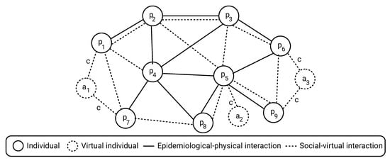where is the set of social edges between individuals () and virtual individuals (), and is the duration of time of interest to evaluate the policies performance. A schematic view of the dynamics and epidemiological-social PIPs is shown in Figure 3.