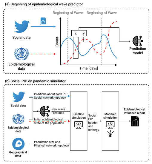 (a) a schematic view of the epidemiological wave predictor training process is presented. Namely, we used epidemiological data from WHO [4] and social media data from Twitter, and the