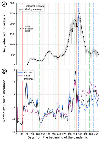 Figure 5a,b present the official daily number of COVID-19-infected individuals in the USA from the WHO database [44] and the normalized amount of social posts on Twitter that mention influenza, COVID, and Vaccine between 30 December 2019, and 30 April 2021, respectively, [23]. In addition, the horizontal lines indicate the beginning of a new pandemic wave based on: