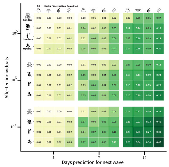 The results of this simulation, as shown in Figure 6, indicates that the different PIPs have an increased efficiency proportional to the time-to-new wave. In other words, the PIPs have an effect proportional to the timing of the prediction of the next wave. Additionally, the values generated by the simulation model indicate that having different strategies for running targeted communication campaigns on SMNs impacts positively and significantly on the targeted sub-populations. Indeed, the ability to anticipate the virus dissemination () depends not only on its biological characteristics but also on social and communication behaviors. These last ones are reflected by the population engagement in respecting the PIPs (i.e., social distancing, mask-wearing, and vaccination). Our model deals with four types of social media targeted strategies.