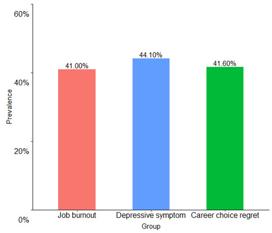 Incidences of job burnout, depressive symptoms, and career choice regret among dental postgraduates exceeded 40%. Specifically, 41.0% reported job burnout, 44.1% had depressive symptoms, and 41.6% reported the career choice regret (Table 2, Figure 1).