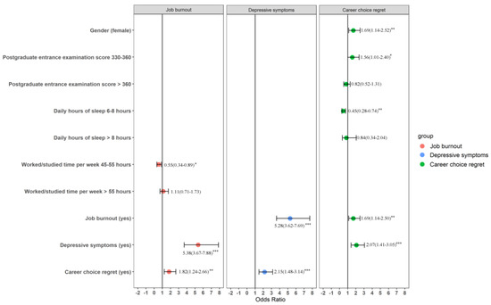 Risk factors of burnout, career choice regret, and depressive symptoms in dental postgraduates. * p < 0.05, ** p < 0.01, *** p < 0.001.