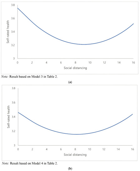 To the contrary, however, they may also indicate better assessment of one’s own health status because of its protection against the potentially lethal viral transmission. While the initial period of physically, hence socially, isolating oneself can be detrimental, over time individuals under self-imposed quarantine may reap the benefits of it. That is, people who are ‘highly’ engaged in social distancing would be less vulnerable to the COVID-19 infection. Thus, by comparing themselves to infected individuals, they may gain a sense of assurance which can boost subjective health perception [10]. In this sense, we might observe better health among people who more faithfully adhere to anti-pandemic guidelines/mandates. Taken together, then, these ideas suggest a potentially curvilinear link between social distancing and subjective health resembling a U-shape curve. In the scholarship, however, it is invariably assumed that this focal link is linear: the greater the level of social distancing, the worse the health outcome. According to systematic reviews [11,12], in fact, not a single finding was discussed in relation to non-monotonicity. The present study’s first objective, therefore, is to empirically examine this possibility.