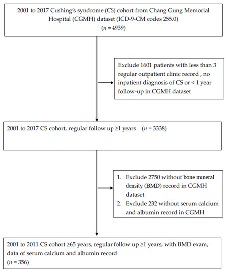 This was a retrospective cohort study using registered data in the CGRD from 1 January 2001 to 31 December 2017. First, 4939 patients who had Cushing’s syndrome (CS) were selected. The diagnosis of CS was based on ICD-9-CM codes (255.0), and during the follow-up study period, one of the following criteria needed to be met: >1 inpatient admission with the diagnosis of CS, >3 outpatient visits with a diagnosis of CS, and regular follow-up visits for at least one year. Second, the selected participants who had a report of bone mineral density (BMD) at the femoral neck and lumbar spine by dual energy X-ray absorptiometry (DXA) (Lunar iDXA, GE Healthcare) were recruited. We excluded patients with <1 year of continuous follow-up visits in the outpatient clinic at the CGM and those who did not have complete blood calcium and albumin test data.