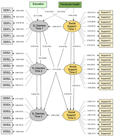 At baseline (T1), education was inversely associated with both social support and depressive symptoms. Perceived health also emerged as significantly associated with both constructs at baseline; both were added as covariates to the model. In contrast, neither sex, religiosity, living arrangement nor age emerged as significantly associated with either latent construct at recruitment. The latter may be due to the restricted age range of participants at recruitment (i.e., 75–96 years of age).