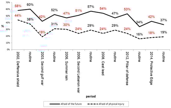 The current paper is based mainly on two parameters that examined fears. The first is more general and may be relevant in everyday situations (“I am afraid of the future”). This parameter was examined in all surveys. The second parameter is relevant mainly during security tension (“I am afraid of being physically injured due to the current security situation”). Participants responded on a Likert scale ranging from 1 (strongly disagree) to 5 (strongly agree). In order to characterize respondents who expressed strong fear of the future or strong fear of physically injury, the variables were dichotomized into high level (“strongly agree” and “agree”) or low level of fear (all other responses).