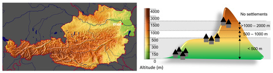 A map depicting altitudes in Austria (left) and visualization of the categories of altitude residence used here (right); <500 m, 500–1000 m and >1000 m (the highest Austrian villages are at about 2000 m). The map has been obtained from http://www.ginkomaps.com, accessed on 13 March 2022 and modified. Wien (Vienna); capital of Austria.