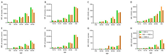 Altitude-dependent mortality rates (MR) of different age-groups of both sexes ((A–D): men; (E–H): women) for all causes (A,B,E,F) and COVID-19 (C,D,G,H). Note the different y-axis, due to lower MRs in lower age-groups.