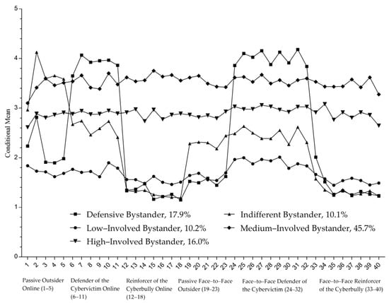 First, the results of the LCA showed that there were five potential patterns of cyberbullying bystanders among college students: defensive bystander (17.9%), indifferent bystander (10.1%), low-involved bystander (10.2%), medium-involved bystander (45.7%), and high-involved bystanders (16.0%). Overall, there were significant differences in the scores and trends of the different roles of cyberbullying bystanders, indicating the heterogeneity in this group. Among the five classes, there were four bystander groups with a high involvement, with the low-involved bystander class being the exception. The total proportion of the four groups was 89.8%, which shows that cyberbullying bystanders are common among college students in China.
