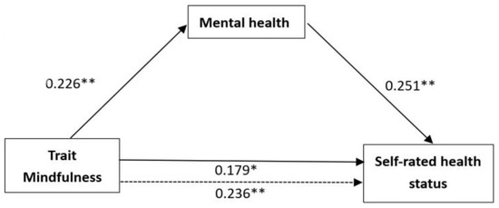 The mediation model of self-rated health (Note: the dotted line denotes that the effect of trait mindfulness on self-rated health is not included as a mediator). * p < 0.05, ** p < 0.01.