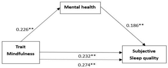As shown in Figure 3, the effects of trait mindfulness on subjective sleep quality, trait mindfulness on mental health, mental health on subjective sleep quality, and trait mindfulness on subjective sleep quality controlling for mental health are 0.274, 0.226, 0.186, and 0.232, respectively. Furthermore, the results of the bootstrap resampling procedure using 5000 samples, Standardized indirect effect = 0.066, SE = 0.112, p < 0.01, 95% bias-corrected bootstrap CI [0.0001,0.2138] also confirm that mental health is a partial mediator between trait mindfulness and subjective sleep quality.