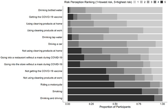 On a scale of 1 (not willing to take risks) to 10 (very willing to take risks), the average score of self-reported willingness to take on risk was 5.4 (SD = 2.0). There was a significant difference in self-reported willingness to take on risks across healthcare roles (p = 0.003), with those in the “other” role category reporting lower risk willingness (more risk averse) than those in the direct patient care, administrative/leadership, or education roles (Figure S1). On a scale of 1 (lowest risk) to 5 (highest risk), the activity with the highest reported mean risk score was drinking and driving (mean = 4.9, SD = 0.28), followed by smoking (mean = 4.7, SD = 0.53) (Figure 1). Not receiving the COVID-19 vaccine and receiving the COVID-19 vaccine yielded mean perceived risk scores of 3.7 (SD = 1.4) and 1.9 (SD = 1.2), respectively.
