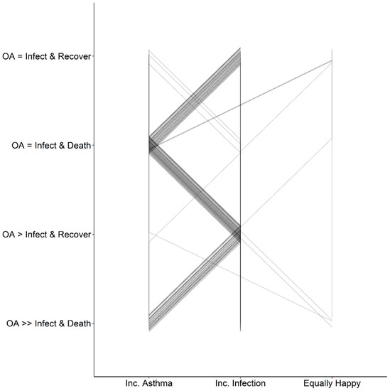 Seven participants maintained their same preference across all scenarios: two consistently chose increased asthma, while five consistently chose increased infection (Figure 2). Forty-six percent (32/69) oscillated between increased infection and increased asthma preferences from the start to the end of the survey, choosing increased asthma whenever risk of infection was specified to end in death. Few participants were equally happy with either choice at any point in the survey (n = 8), and only one participant was consistently equally happy with either choice across scenarios (Figure 2).