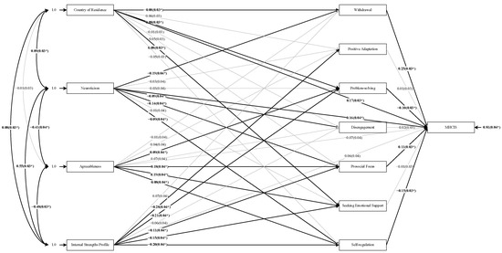 The outcomes of the path analysis, including the path coefficients associated with all direct effects in the model, are shown in Figure 1. According to Hoyle [61], t-values that fall beyond ±1.96 and ±2.56 are considered significant at the 0.05 and 0.01 levels, respectively. As indicated, the direct effects from the country of residence to withdrawal, problem-solving, and seeking emotional support, from neuroticism to withdrawal, disengagement, prosocial focus and self-regulation, from agreeableness to problem-solving, prosocial focus, seeking emotional support and self-regulation, as well as from cluster membership to all coping strategies (except for withdrawal and disengagement) are all significant. Direct effects from both the country of residence and neuroticism on MHCIS are significant.