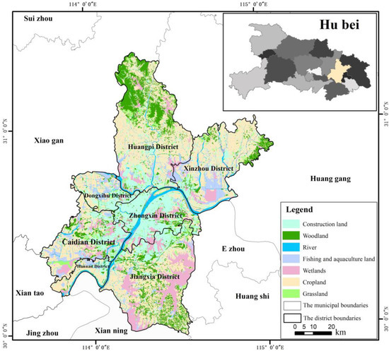 Wuhan City was selected as the case study area (Figure 1) with particularly prominent contradiction between economic development and nature protection caused by urbanization. It was located in the subtropical monsoon climate zone, with abundant rainfall throughout the year. It consisted of 7 central urban areas and 6 outer suburbs, with a total area of 8569 km2, of which, water area accounts for 24.7%. It has a permanent resident population of 12.45 million and a GDP of 965.64 billion yuan. It was called “a first-tier city floating on water”. Under the background of accelerated urbanization, the population size has increased rapidly, and the urbanization construction has a significant impact on the change in land use types in Wuhan, affecting the economic production structure and the natural ecological environment.