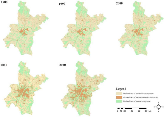 To explore the relationship among the land use of a natural ecosystem (LUNE), the land use of a productive ecosystem (LUPE), and the land use of a socio-economic system (LUSE), this study analyzed the transformation of LULC and ecosystem services for these three LULC-classified types based on the LULC data for Wuhan City in 1980, 1990, 2000, 2010, and 2020. The LULC changes mainly focus on the transfer between LUPE and LUSE. Influenced by the urban expansion of economic development, the LUSE type expanded by 2.7 times, with the LUPE area decreasing by nearly 30%. The area of LUNE type remained stable. During the past 40 years, the ecosystem services in Wuhan decreased significantly, including a 10.6% decrease in carbon storage, a 12.4% increase in poor habitat area, a 16% decrease in grain yield, a 33% decrease in total nitrogen output per unit area, and a 32% increase in total water yield. Generally, the five ecosystem services showed synergistic with each other, and had the highest correlation with the economic type, which showed that they were most affected by the economic type. Coupled with the protection policy of natural ecosystem, the LUPE type played the key role in regional ecological environment.