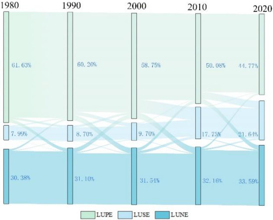 As shown in the Figure 2, the area of the LUSE type was the largest type among the three classified types during the forty years from 1980s to 2020s, following the LUPE and LUNE types. At the same time, the area of the LUPE and LUSE, respectively, showed a decrease and increase, and the area of LUNE tended to be stable (Figure 2). In these 40 years, the LUSE type kept going down occupying from the 61.63% to the 44.77%, whereas the LUPE type sustained an increased from a 7.99% occupation rate to a 21.64% one. The proportion of the LUNE type of area has always been about 30%.