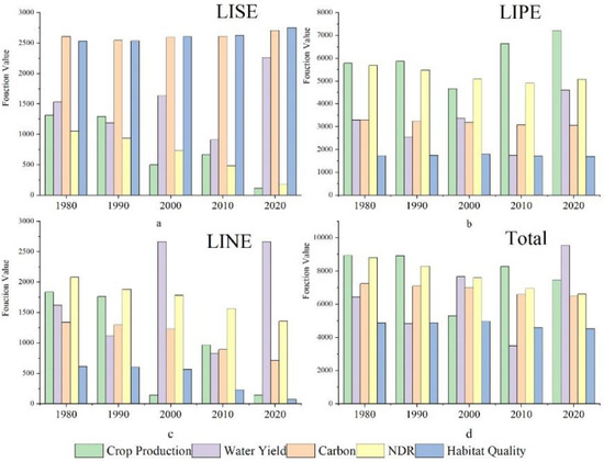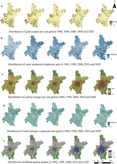 The results showed that there were significant differences in variation among the five ecosystem services (grain yield, water yield, water quality purification, habitat quality, and carbon storage) in Wuhan during 1980–2020 (Figure 4 and Figure 5). Influenced by climate conditions and rapid economic development, the ecosystem services of grain yield, habitat quality, and carbon sequestration function all showed a downward trend. The water purification and water yield increased.