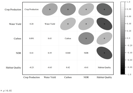 As shown in Figure 6, among the five ecosystem services, pairwise different services were combined into 20 groups of relationships, and all showed significant correlation. Habitat quality was negatively correlated with grain yield, water yield, and water purification, which indicated a trade-off relationship, whereas other pairwise services were positively correlated with each other, denoting a synergistic relationship. The synergy between carbon storage and water yield was the highest (0.429), and the synergy between carbon storage and grain yield was the lowest (0.091). The most significant trade-off was between habitat quality and water yield (−0.429), and the least trade-off was between habitat quality and grain yield (−0.231).