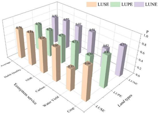Grey correlation analysis was used to quantitatively discuss the relationship between LULC types and five ecosystem services. The correlation degree between three LULC classes and five ecosystem services were from 0.53 to 0.85, with an average correlation degree of 0.73. The results showed that LULC type had a great influence on ecosystem services in Wuhan in 1980–2020. (Figure 7) Generally, the correlation degree between the LUSE types and grain yield, carbon storage, water purification, and habitat quality were strong, and all the gray correlation degrees were above 0.8, indicating that the changes of social-economic land types were closely related to the four ecosystem services. The LUPE and the LUNE types most impacted the grain production and carbon storage with the higher correlation degree, respectively. However, all the correlation degree of water production with the LUNE, LUPE, and LUSE were less than 0.6.