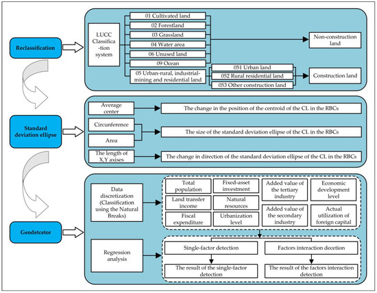 Based on LUCCs data, this paper uses reclassification technology to extract the CL of RBCs, scrutinizes the spatiotemporal differentiation characteristics of CLE by taking the standard deviation ellipse, and analyzes the driving factors of CLE in RBCs by employing the geographic detector. The flow of various methods is shown in Figure 2.
