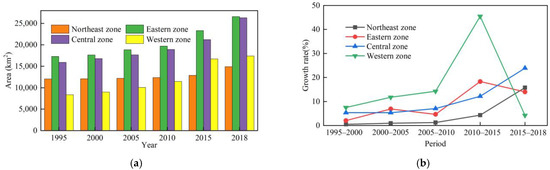 From the perspective of the CL growth rate, from 1995 to 2018, the CL change status in the RBCs in each region was as follows (Figure 5b): (1) the CL growth rate in the RBCs in the eastern region indicated a fluctuating upward trend, of which the highest growth rate of 18.33% from 2010–2015 occurred because the eastern region exhibited the fastest economic growth and highest economic vitality in China. In the process of rapid economic growth, it was highly necessary to increase the CL area to ensure production and living activities, so the CL area in the RBCs in this region rapidly expanded. (2) The CL growth rate in the RBCs in the central region consistently revealed an increasing trend, and the growth rate was the highest from 2015 to 2018, at 23.93%, indicating that with the implementation of strategies such as the Rise of Central China and Central Plains Urban Agglomeration, the RBCs in the central region could achieve more adequate development. With the large population in the central region, the demand for CL was high, so the CL expansion intensity and speed were accelerated. (3) The CL area in western RBCs was the smallest among the four regions, with a total increase of 9051.09 km2. The growth rate was the highest between 2010 and 2015, at 45.48%. From 2015–2018, the growth rate sharply declined, indicating that the expansion intensity decreased. The RBCs in the western region were characterized by a small CL area and a relatively low economic development level, so the expansion was not notable. (4) Before 2010, the CL area in the RBCs in the northeast region slowly increased, with a growth rate lower than 2% during each period. After 2010, the trend of CL expansion accelerated, especially between 2015 and 2018, and the growth rate increased to 15.76%.