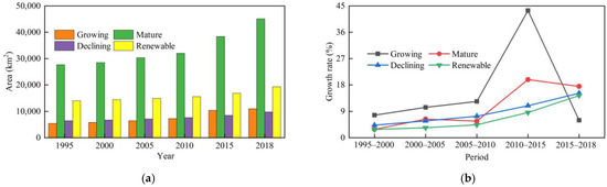 Based on the CL growth rate, the change in CL in the various types of RBCs from 1995 to 2018 was as follows (Figure 6b): (1) the CL area in the growing RBCs increased by 5576.95 km2, which is consistent with the overall CL growth rate in the 126 RBCs, indicating an upward trend from 1995 to 2015, with the fastest growth from 2010 to 2015, at 43.42%, and a downward trend after 2015. (2) The CL area in the mature RBCs increased by 17,429.07 km2, the growth rate reached peaked (19.82%) from 2010 to 2015, and then slightly declined. (3) The CL area in the declining RBCs was the smallest among the four regions, with a total increase of 3301.65 km2, but the growth rate was increasing. (4) The CL growth rate in the regenerative RBCs was not high, with a total increase of 5327.05 km2, but the growth rate was also persistently increasing.