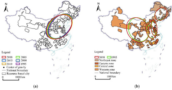 To analyze the variation characteristics of ECL in the RBCs in detail, standard deviation ellipses were generated for each region, and the following results could be obtained: from 1995 to 2018, (1) ECL in the RBCs in Northeast China was not notable, mainly due to the lack of growth power in the RBCs within this region, and the demand for CL declined. With increasing land development intensity in southern cities such as Huludao, Panjin, and Anshan, and decreasing land development intensity in northeastern cities such as Mudanjiang and Qitaihe, the standard deviation ellipse slightly expanded from north to south. (2) The expansion direction of the CL area in the RBCs in the eastern region was the north–south direction. The RBCs in this region were mainly distributed in Hebei, Shandong, and Jiangsu provinces. The number of RBCs in Zhejiang, Fujian, and Guangdong provinces was small, and the development intensity was low. The driving force of spatial expansion in this region mainly originated from Hebei, Shandong, and Jiangsu provinces. From the perspective of the land development intensity, the land development intensity in both northern cities, such as Zhangjiakou, Zibo, Dongying, and Laiwu, and southern cities, such as Suqian and Xuzhou, increased, so the standard deviation ellipse expanded along the north–south direction. (3) The expansion direction of CL in the RBCs in Central China was the north–south direction, and the standard deviation ellipse range increased, indicating that the urban CL area significantly increased along the north–south direction. From the perspective of the land development intensity, the land development intensity in eastern and western cities decreased, such as Huainan, Maanshan, and Bozhou, but the land development intensity in northern and southern cities increased, such as Yangquan, Lvliang, Ezhou, and Yichun, so the standard deviation ellipse expanded along the north–south direction. (4) The expansion direction of CL in the western RBCs was the east–west direction, and the expansion was very obvious. In this area, only the land development intensity in Baotou city decreased, whereas the land development intensity in the other cities exhibited an increasing trend, especially in the RBCs in the southwestern region such as Zhaotong, Bijie, Qiannan, and Qianxinan, which promoted westward expansion of the standard deviation ellipse.