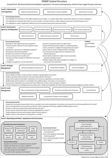 The first step in constructing the STAMP control structure was to map the recommendations to the applicable level of the system hierarchy; these recommendations served as the control actions of the STAMP control structure. The other fundamental component of the STAMP control structure involved identifying the controllers responsible for control actions at each level of the system. The controllers were the recipients of the recommendations, as identified in the coroners’ reports. For example, vehicle manufacturers were identified as a controller as a result of being specifically addressed in a coroner’s recommendation in regard to improving safety features on their vehicles and equipment. Other actors who were deemed to have a controlling influence in the system included law-making bodies, regulatory authorities, managers, and tactical decision-makers.