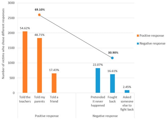 Our findings suggested that the responses of victims were relatively positive. A total of 69.10% of the victims chose positive responses, mainly seeking help from teachers and parents, which was higher than the proportion of Haerbin primary school students []. The reasons may be as follows. First, the contents of the questionnaire used in this study were different from that of previous studies. Second, the study participants were different. There are differences in the economic and educational levels of the regions where the participants of different studies were located. Some studies have pointed out that various economic and educational levels are closely related to school bullying []. Alternatively, the positive response rate may indicate that the status of bullying response among primary school students is improving in China, due to the influence of various online media and higher levels of attention to school bullying from families and schools. Although the positive response to primary school bullying in this survey was relatively high, we have to consider those students who did not respond positively. Nearly one-third of the victims chose to respond negatively, which indicates that it is imperative to develop interventions for preventing and reducing the occurrence of school bullying.