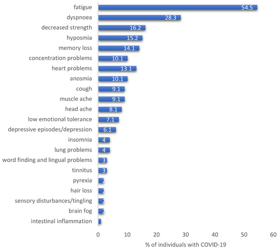 The most common PLC symptoms were fatigue (n = 54, 54.5%), dyspnoea (n = 28, 28.3%), decreased strength (n = 16, 16.2%), decreased sense of smell (n = 15, 15.2%), and memory loss (n = 14, 14.1%) including punctual amnesia (n = 1, 1.0%), see Figure 2. Further highly prevalent symptoms included concentration problems (n = 10, 10.1%), heart problems (n = 13, 13.1%), a decreased sense of taste (n = 10, 10.1%), coughing (n = 9, 9.1%), muscle aches (n = 9, 9.1%), and headaches (n = 8, 8.1%) as well as lung problems (n = 4, 4.0%), see Figure 2. Symptoms such as anxiety including irritability (n = 7, 7.1%) and increased skin sensitivity, noise sensitivity, and sensitivity to temperature (n = 5, 5.1%) were also reported, as were depressive episodes or depression (n = 6, 6.1%) and insomnia (n = 4, 4.0%). Other interesting self-reported symptoms which occurred less frequently included word finding or lingual problems (n = 4, 4.0%), tinnitus (n = 3, 3.0%), pyrexia (n = 3, 3.0%), hair loss (n = 2, 2.0%), sensory disturbances (tingling) of the lip, hands, and feet (n = 2, 2.0%), the so-called ‘brain fog’ (n = 2, 2.0%), and intestinal inflammation (n = 1, 1.0%), see Figure 2. Adjusted multivariable logistic regression analysis revealed that individuals with the comorbidity asthma had higher odds (OR 1.62, 95% CI: 0.99–2.65, p = 0.05) of reporting COVID-19 symptoms in the registry. Male individuals had relevant lower odds of reporting COVID-19 symptoms in the registry (OR 0.65, 95% CI: 0.49–0.89, p = 0.006). Furthermore, an increased BMI or the comorbidity hypertension were not significantly associated with COVID-19 symptoms.
