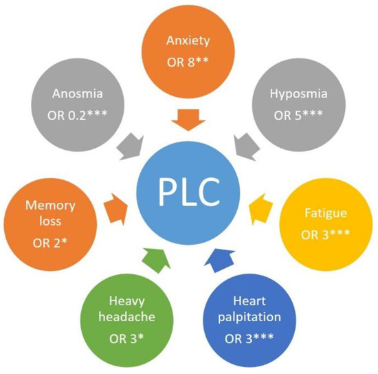 Self-reported Covid-19 related symptoms (outer coloured circles) with a relevant and significant probability for the development of PLC (inner blue circle) according to the results from adjusted multivariable logistic regression analysis. The number in the outer circles represents the probability (OR) of developing PLC, the stars represent the statistical significance. OR, odds ratio. * p < 0.05; ** p < 0.01; *** p < 0.005.