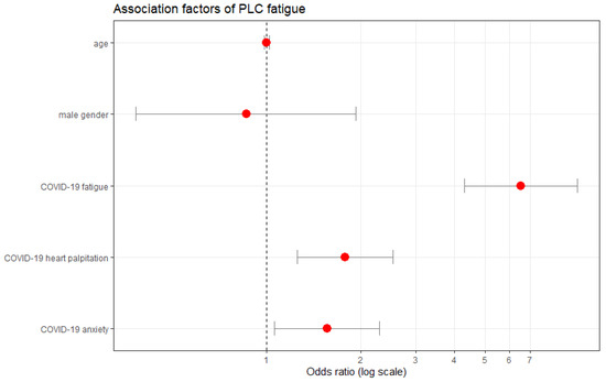 Probability of developing PLC fatigue, adjusted multivariable logistic regression analysis. Factors presented (except age and gender) are associated with a statistically significant (p < 0.05) reduced probability (left-hand side from the indicated margin) or increased probability (right-hand side from the indicated margin) of developing PLC fatigue; PLC, post-acute COVID-19 syndrome; red dots represent the probability (odds ratio) of developing PLC fatigue.