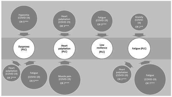 Flow chart for the association between self-reported COVID-19 symptoms (dark grey circles) and PLC symptoms (white circles). The number in the dark grey circles represents the probability (OR) of developing the relevant PLC symptom, the stars represent the statistical significance; OR, odds ratio, calculated from adjusted multivariable logistic regression analysis. ** p < 0.01; *** p < 0.005.