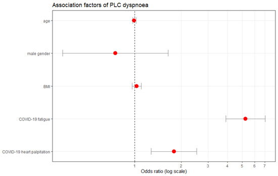 Probability of developing PLC dyspnoea, adjusted multivariable logistic regression analysis. Factors presented (except age, gender and BMI) are associated with a statistically significant (p < 0.05) reduced probability (left-hand side from the indicated margin) or increased probability (right-hand side from the indicated margin) of developing PLC dyspnoea; PLC, post-acute COVID-19 syndrome; BMI, body mass index; red dots represent the probability (odds ratio) of developing PLC dyspnoea.