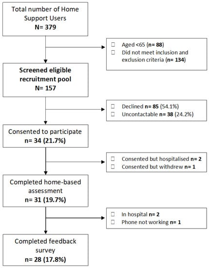 This multi-method study included in-home assessments of sarcopenia, frailty and malnutrition and qualitative post-study feedback surveys with dependant older adults. Participants were invited to take part in the study based on the following inclusion criteria: aged 65 years and older, living at home and in receipt of state-funded home care services. Moderate to severe cognitive impairment or inability to provide informed consent and those in receipt of palliative care or medically unstable were excluded from the eligible recruitment pool (Figure 1).