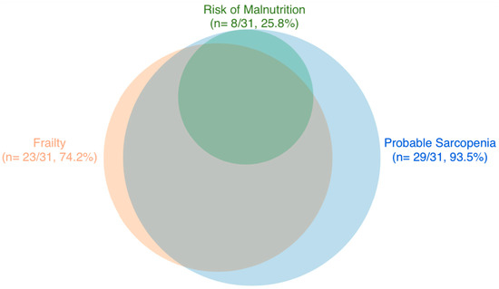 Based on the Clinical Frailty Scale (CFS), most of the group were classified as either frail or vulnerable (n = 30/31, 97%). Specifically, 74.2% had frailty (n = 23/31), predominantly in the mild to moderate category (n = 21/31, 67.7%) (Table 1). According to the MNA-SF, over a quarter (25.8%, n = 8/31) were at-risk of malnutrition. There was a high degree of intersectionality in the screening of probable sarcopenia, frailty, and malnutrition risk, detected in 22.6% of the study population (n = 7/31) (Figure 2).