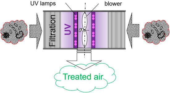 We upgraded this prototype by incorporating UV-C lamps to enhance the air-cleaning effect, especially for viable airborne pathogens. We also rearranged the filters to create more space for placing UV treatment between the filters and the blower. A simplified conceptual schematic illustrating the air treatment of the upgraded prototype is shown in Figure 1.