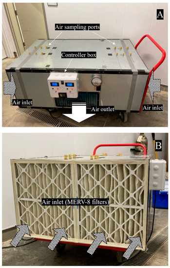 The FastAir prototype (2.54 × 1.52 × 1.02 m, 100 × 60 × 40 in.) was initially designed and manufactured by Kryton Engineered Metals Inc. (Cedar Falls, IA, USA) for filtering out PM generated during manufacturing and welding in indoor spaces. The original prototype without UV is shown in Figure S1 in the Supplementary Materials. Inside the prototype, an air blower was connected by a belt to a motor with two flow rate modes, termed low (~0.5 m3/s) and high (~1.0 m3/s). There were two layers of filters stacked inside the chassis, MERV-8 filters (51 × 61 × 10 cm, 20 × 24 × 4 in.) (Air Handler manufactured for W.W. Grainger, Inc., Lake Forest, IL, USA) on the outside and MERV-13 filters (fiberglass pocket filters, 51 × 61 × 38 cm, 20 × 24 × 15 in.) (Air Handler manufactured for W.W. Grainger, Inc., Lake Forest, IL, USA) on the inside (Figure S2).