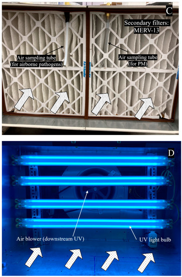 The upgraded prototype is shown in Figure 2A–D. The interior of the prototype was modified to accommodate the addition of UV-C lamps. The overview of the original and upgraded configurations are shown in Figures S3 and S4, respectively. MERV-8 filters on the outmost layer were unchanged. The modifications included replacing the 0.38 m (15 in.) deep fiberglass MERV-13 pocket filters with pleated 0.10 m (4 in.) deep MERV-13 filters, adding aluminum (Al) mesh filters, selecting and installing UV-C light bulbs and fixtures that provided a UV dose consistent with recommendations for SARS-CoV-2 inactivation (as described in Results Section 3.5). The reason for choosing narrower MERV-13 filters was to add space to install UV light and ensure sufficient treatment time for inlet air under UV irradiation. Because long-time exposure to UV can degrade filter fibers, an aluminum mesh filter (51 × 61 × 5 cm, or 20 × 24 × 2 in.) (All-Filters, Inc., Reno, NV, USA) was selected and placed between the UV light and filters to allow sufficient air flow while blocking the majority of UV from irradiating the MERV filters (Figure S5). A controller box that controls the electric power of the blower and UV light was attached to the prototype chamber (Figure S6).