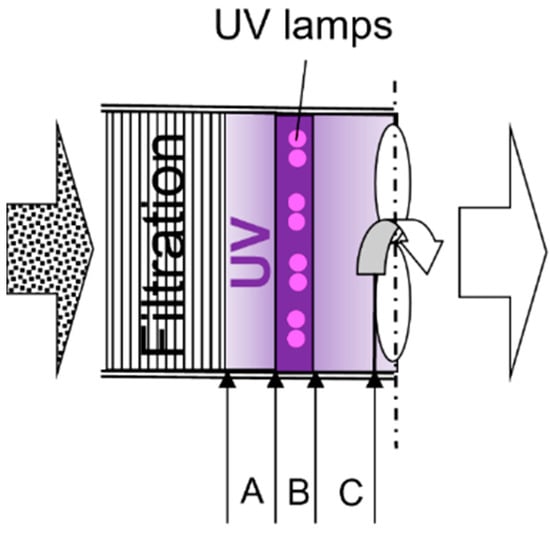 The schematic of UV irradiation inside the FastAir prototype. The filtered air entered three UV treatment zones, A, B, and C (upstream from lamps, in the near vicinity of lamps, and downstream of lamps).